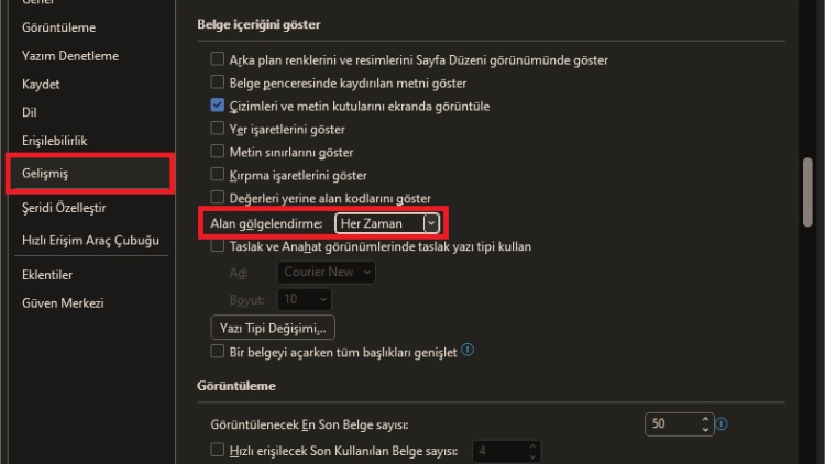 Word Seçenekleri -> Gelişmiş -> Belge İçeriğini Göster -> Alan Gölgelendirme = Her Zaman